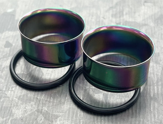 PAIR of Unique Rainbow PVD Plated 316L Surgical Steel Single Flare Tunnels Plugs with O-Rings - Gauges 10g (2.5mm) thru 1" (25mm)