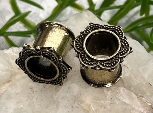 PAIR of Unique Antique Gold IP Rose of Sharon Tunnels Double Flare Steel Tunnels/Plugs - Gauges 0g (8mm) thru 5/8" (16mm)