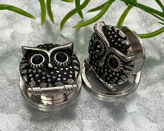 PAIR of Unique Owl with Black Gem Eyes Steel Screw Fit Tunnels/Plugs - Gauges 9/16 (14mm) thru 13/16" (20mm)