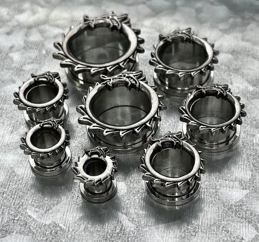 PAIR of Unique Coiled Dragon Rimmed Steel Screw Fit Steel Tunnels/Plugs - Gauges 0g (8mm) thru 1" (25mm)