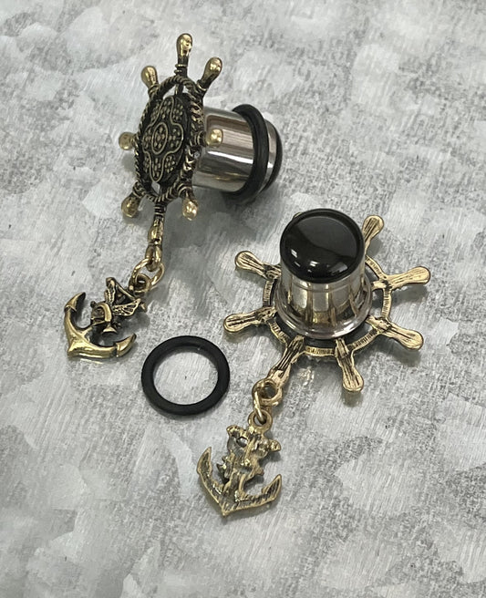 PAIR of Unique Ship Wheel with Anchor Dangle Steel Single Flare Tunnel/Plug and O-rings