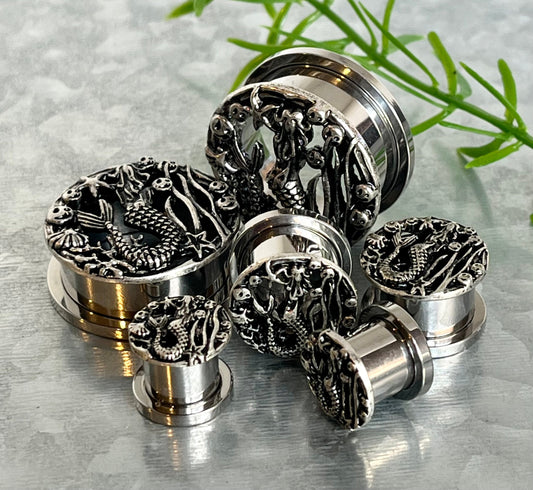 PAIR of Stunning Siren - Mermaid Surgical Steel Screw Fit Stainless Steel Tunnels/Plugs - Gauges 00g (10mm) thru 1" (25mm)