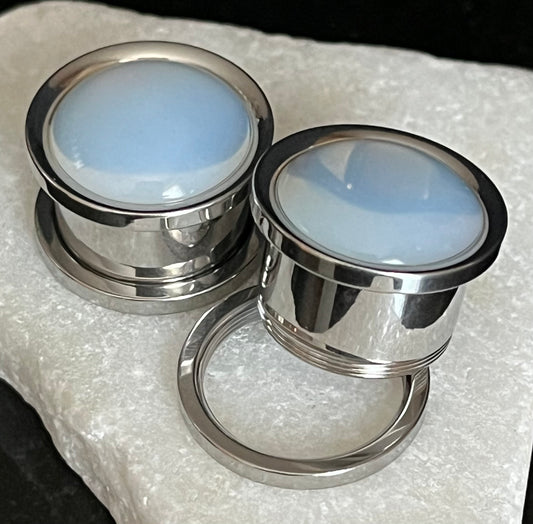 PAIR of Stunning Opalite Dome Steel Screw Fit Tunnels/Plugs - Gauges 2g (6mm) thru 5/8" (16mm)