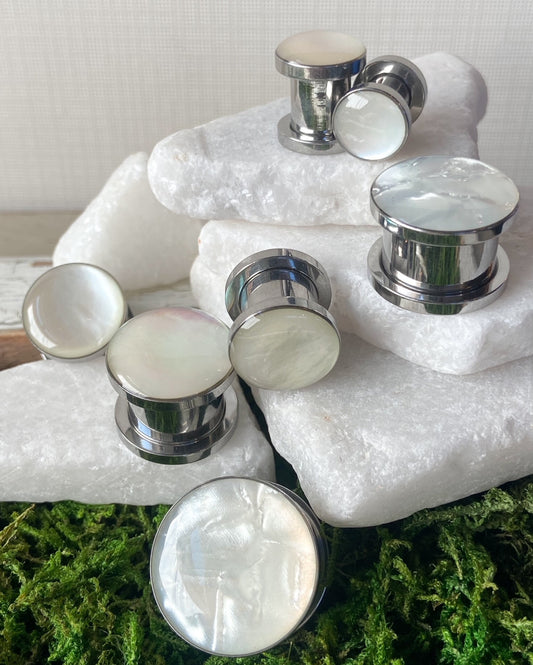 PAIR of Stunning Mother of Pearl Surgical Steel Screw Fit Tunnels/Plugs - Gauges 2g (6mm) thru 5/8" (16mm)