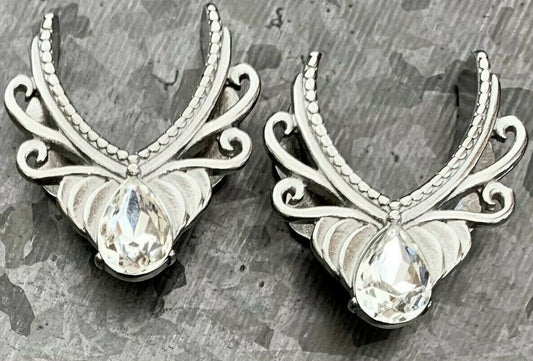PAIR of Unique Floral Filigree V-Shaped Pear Gem Surgical Steel Ear Spreader Tunnels/Plugs - Gauges 00g (10mm) thru 1" (25mm)