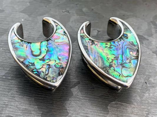 PAIR of Stunning Abalone Tear Drop Surgical Steel Saddle Ear Spreader Tunnels/Plugs/Hangers - Gauges 0g (8mm) thru 5/8" (16mm)