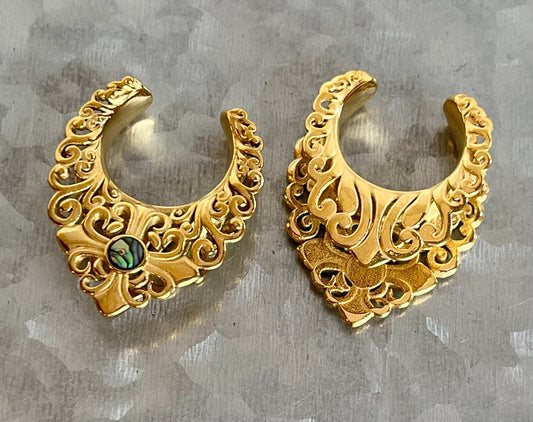 PAIR of Stunning Gold Plated Filigree Abalone Saddle Ear Spreader Hanger-Tunnels/Plugs - Gauges 0g (8mm) thru 3/4" (19mm)
