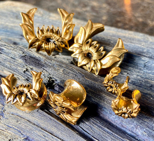 PAIR of Unique Gold Plated Lotus Flower Ear Spreader Surgical Steel Tunnels/Plugs - Gauges 0g (8mm) through 3/4" (19mm)