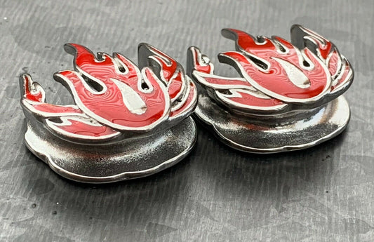 PAIR of Unique Red Flames Steel Saddle Ear Spreader Tunnels/Plugs - Gauges 00g (10mm) thru 1" (25mm)
