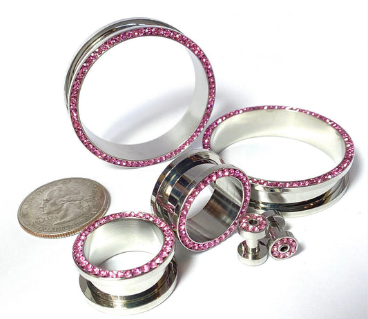 PAIR Pink CZ Gem Rimmed 316L Surgical Steel Screw Fit Tunnels Plugs Gauges