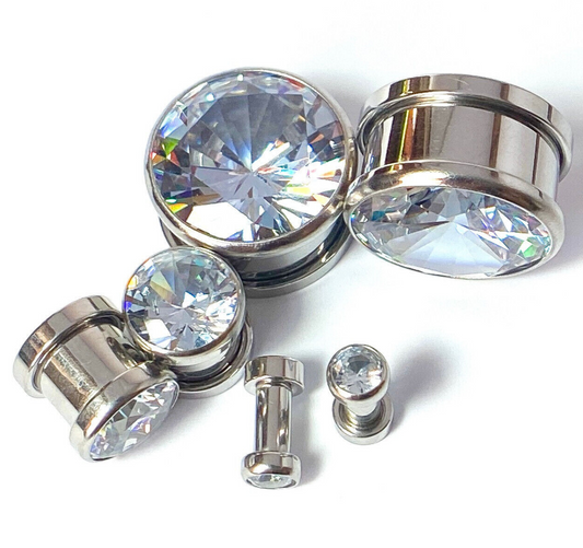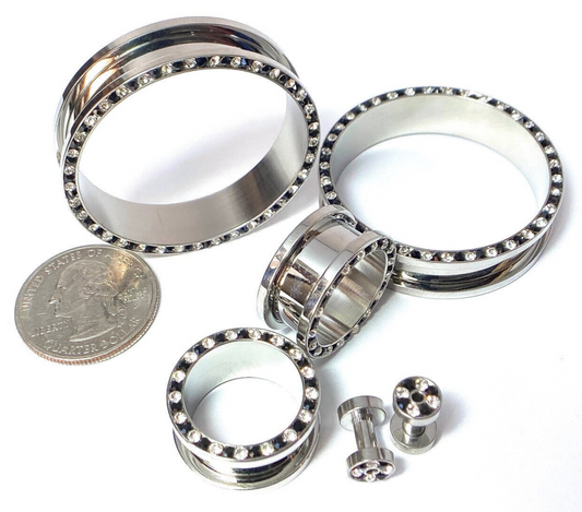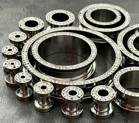 PAIR Clear CZ Gem Rimmed 316L Surgical Steel Screw Fit Tunnels Plugs Gauges