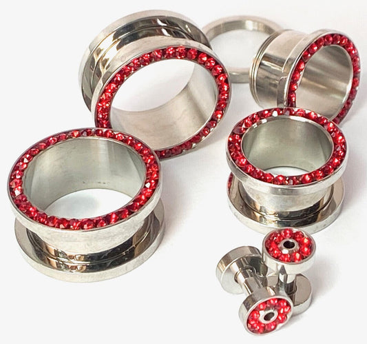 PAIR Red CZ Gem Rimmed 316L Surgical Steel Screw Fit Tunnels Plugs Gauges