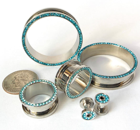 PAIR Aqua CZ Gem Rimmed 316L Surgical Steel Screw Fit Tunnel Plug Gauges