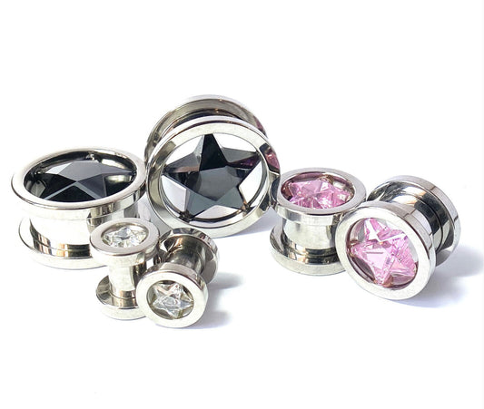PAIR Star CZ Gem Screw Fit Tunnels Plugs Gauges Earlets Body Jewelry Piercing