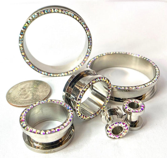 PAIR Aurora Borealis Gem Rimmed 316L Surgical Steel Screw Fit Tunnel Plug Gauges