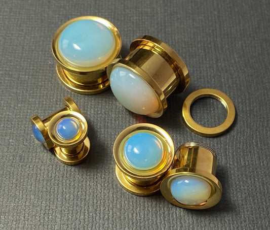 PAIR Opalite Stone Dome Gold Steel Screw Fit Tunnels Gauge Plugs Body Jewelry