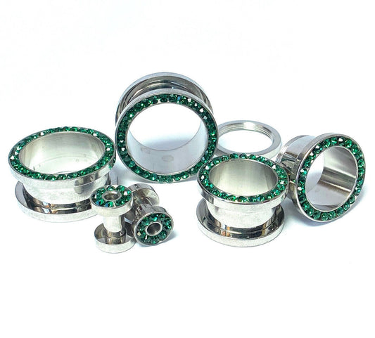 PAIR Emerald Green Gem Rimmed 316L Surgical Steel Screw Fit Tunnels Plugs Gauges