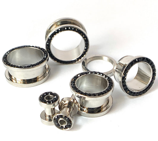 PAIR Black CZ Gem Rimmed 316L Surgical Steel Screw Fit Tunnels Plugs Gauges