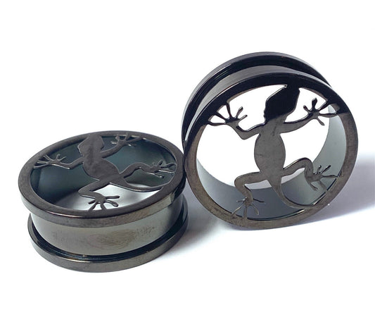 PAIR Black Lizard Steel Screw Fit Tunnels Plugs Earlet Gauges Gecko Body Jewelry