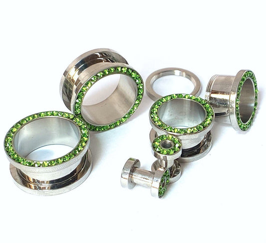 PAIR Peridot Green Gem Rimmed 316L Surgical Steel Screw Fit Tunnels Plugs Gauges