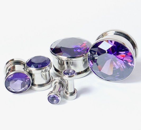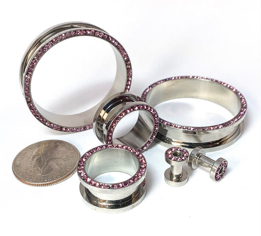 PAIR Lavender CZ Gem Rimmed 316L Surgical Steel Screw Fit Tunnels Plugs Gauges