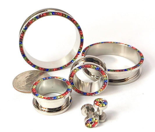 PAIR Rainbow CZ Gem Rimmed 316L Surgical Steel Screw Fit Tunnels Plugs Gauges