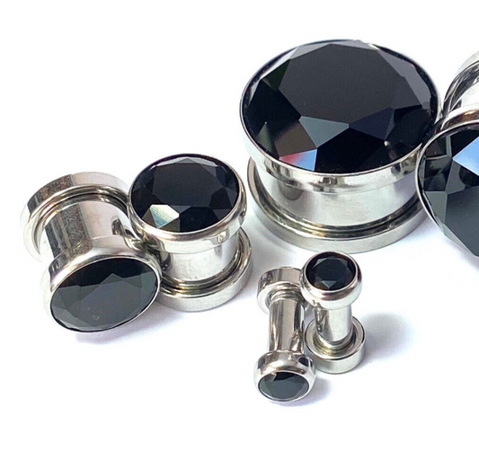 PAIR Large Black Gem Screw Fit Tunnel Plugs Gauges Pierced Body Jewelry Piercing