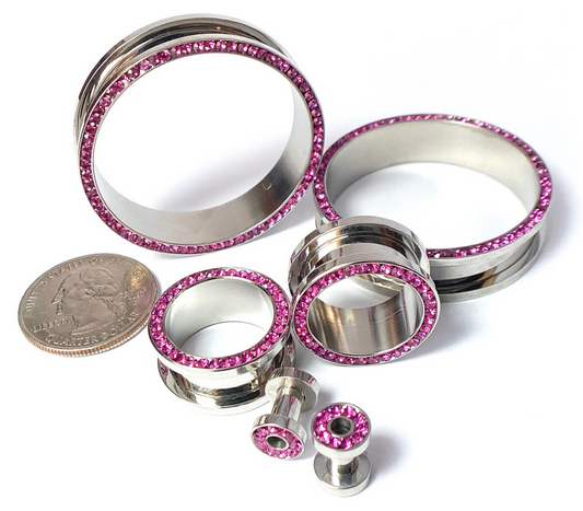 PAIR Fuchsia CZ Gem Rimmed 316L Surgical Steel Screw Fit Tunnels Plugs Gauges
