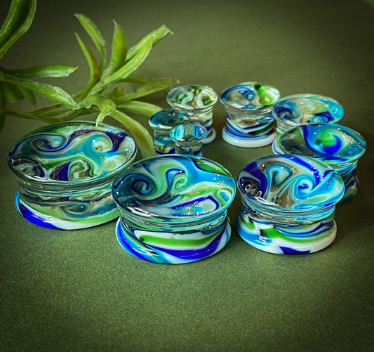 PAIR Green & Blue Swirl Design Pyrex Glass Plugs Gauge Body Ear Piercing Jewelry