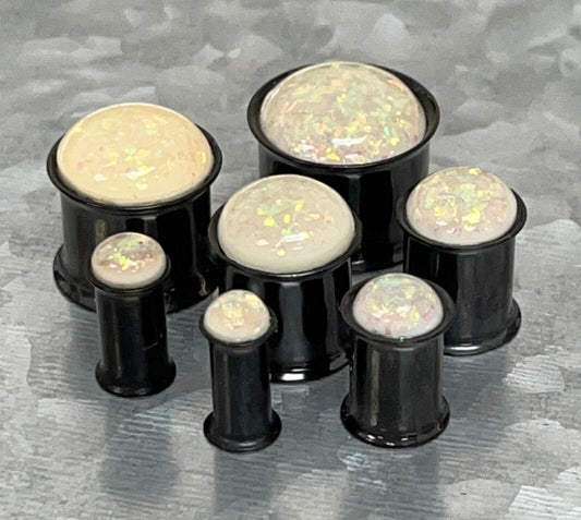 PAIR Synthetic Opal Black Plated Double Flare Tunnels Ear Plugs Earlets Gauges