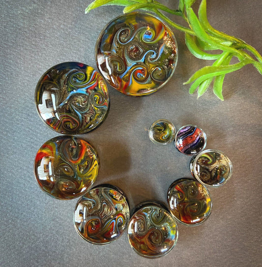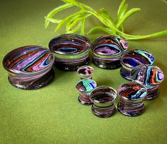PAIR Rainbow Sparkle Swirls Design Pyrex Glass Plugs Gauges Body Jewelry