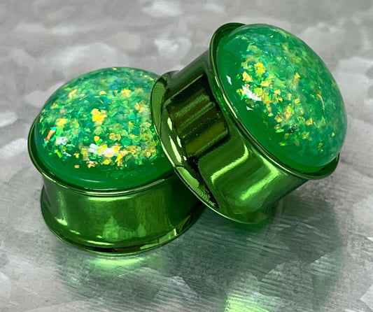 PAIR Green Synthetic Opal Titanium Tunnels Double Flare Plugs Earlets Gauges