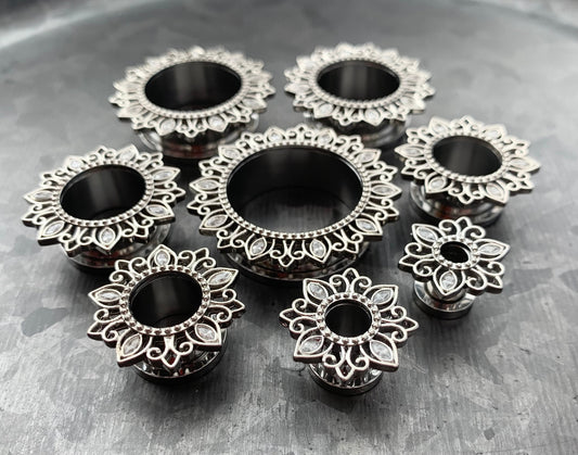 PAIR of Stunning Tribal Lotus Flower with CZ Gem Petals Screw Fit Tunnels/Plugs - Silver or Gold - Gauges 2g (6mm) thru 1"(25mm)