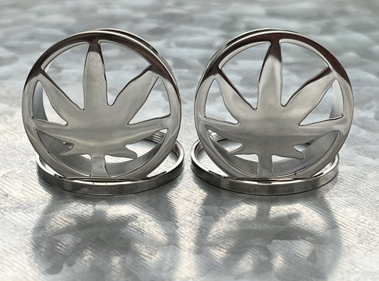PAIR of Unique Pot Leaf Marijuana Steel Screw Fit Tunnels/Plugs - Gauges 0g (8mm) thru 1" (25mm)