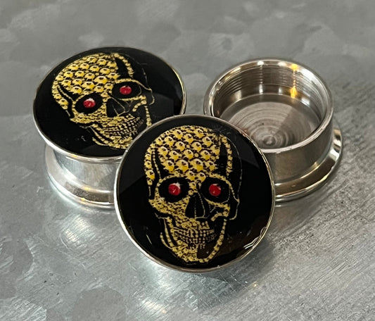 PAIR of Unique Yellow Skull with Red Eyes Steel Screw Fit Stash Plugs/Tunnels - Gauges 2g (6mm) thru 5/8" (16mm)