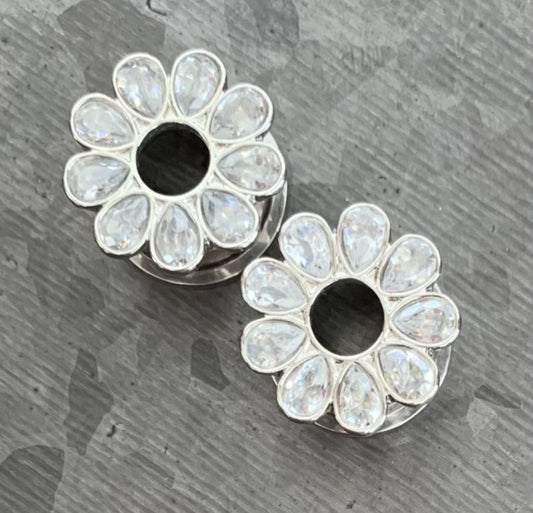 PAIR of Stunning CZ Gem Set Flower Steel Screw Fit Tunnels/Plugs - Clear, Red or Blue - Gauges 4g (5mm) thru 5/8" (16mm)