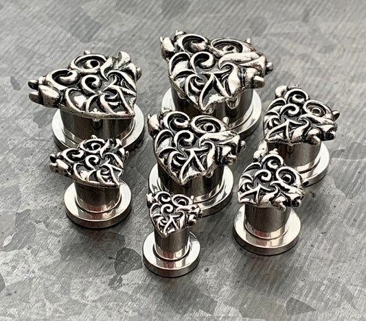 PAIR of Stunning Antique Silver Devil Heart Surgical Steel Internally Threaded Tunnels/Plugs - Gauges 2g (6mm) thru 5/8" (16mm)