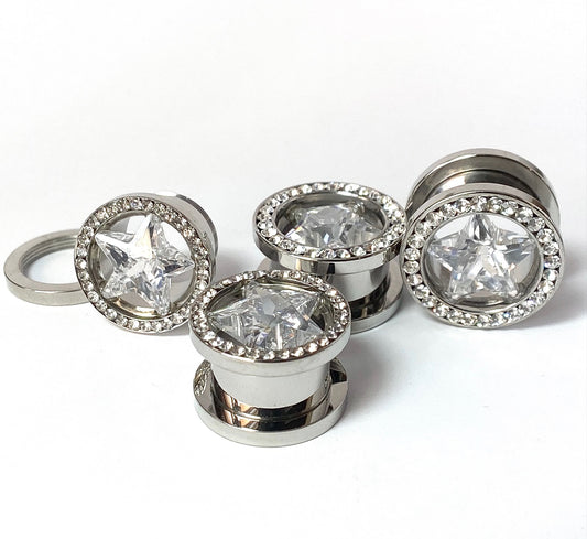 PAIR of Clear Star CZ Gem Surrounded by a Clear CZ Rim Steel Screw Fit Plug