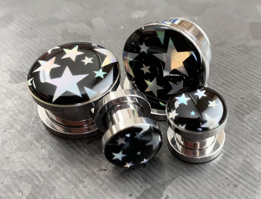 PAIR of Beautiful Hologram Star Screw Fit Surgical Steel Tunnels/Plugs - Gauges 2g (6mm) thru 5/8" (16mm)