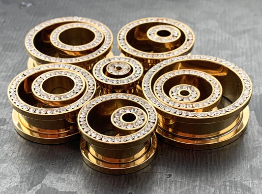 PAIR of Stunning Gold PVD plated CZ Gem Rimmed Tunnels/Plugs - Gauge 8g (3.2mm) thru 1" (25mm)