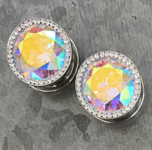 PAIR of Unique Steel Screw Fit Plugs with Large Aurora Borealis CZ Gem Surrounded by a CZ Rim - Gauges 8g (3.2) thru 5/8" (16mm)