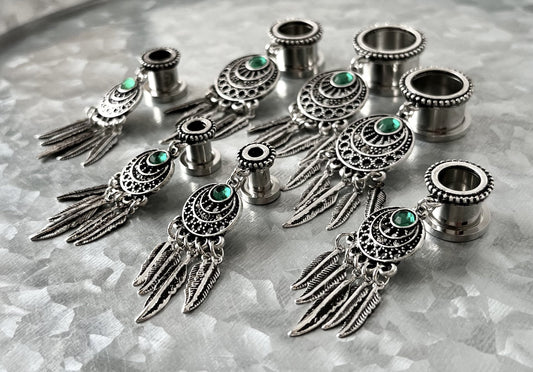 PAIR of Unique Dream Catcher with Beaded Edge and Green Crystal Gem Dangle Screw Fit Tunnels -Gauges 4g (5mm) thru 5/8" (16mm)
