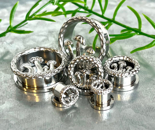 PAIR of Unique Mushrooms L316 Surgical Steel Screw Fit Tunnels/Plugs - Gauges 1/2" (12mm) up to 1" (25mm)