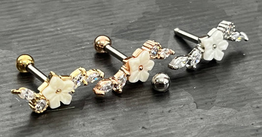 1 Piece Mother of Pearl Flower with CZ Gem Vine Tragus Cartilage Stud - 16g - Wearable Length 6mm