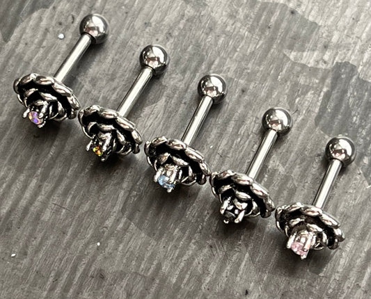 1 Piece Unique Antique Silver Flower with Center CZ Gem Tragus Barbell Stud - 16g