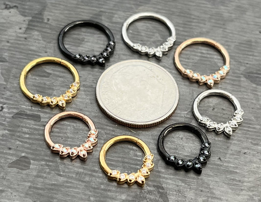 1 Piece Stunning Seven CZ Gem Leaves Steel Hinged Segment Ring - 16g - 8mm or 10mm Internal Diameter - Black, Gold, Rose Gold and Silver!