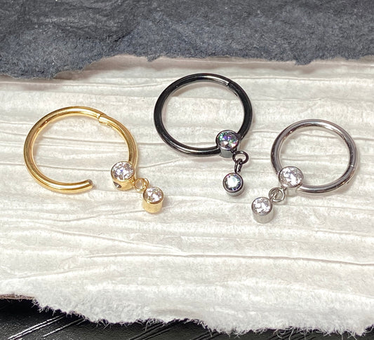 1 Piece Stunning Solid Titanium Gem Dangle Hinged Segment Ring - Gauge 16g - 8mm or 10mm - Black, Gold or Silver!