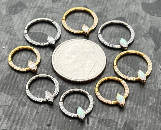 1 Piece Solid Titanium Marquise Hinged Segment Septum Ring - CZ Gem or Opal - 16g, Diameter 10mm or 8mm
