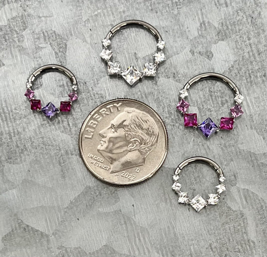 1 Piece Solid Titanium 7 Square CZ Gems Hinged Segment Septum Ring - Clear or Multi-Colored - 16g, Diameter 10mm or 8mm