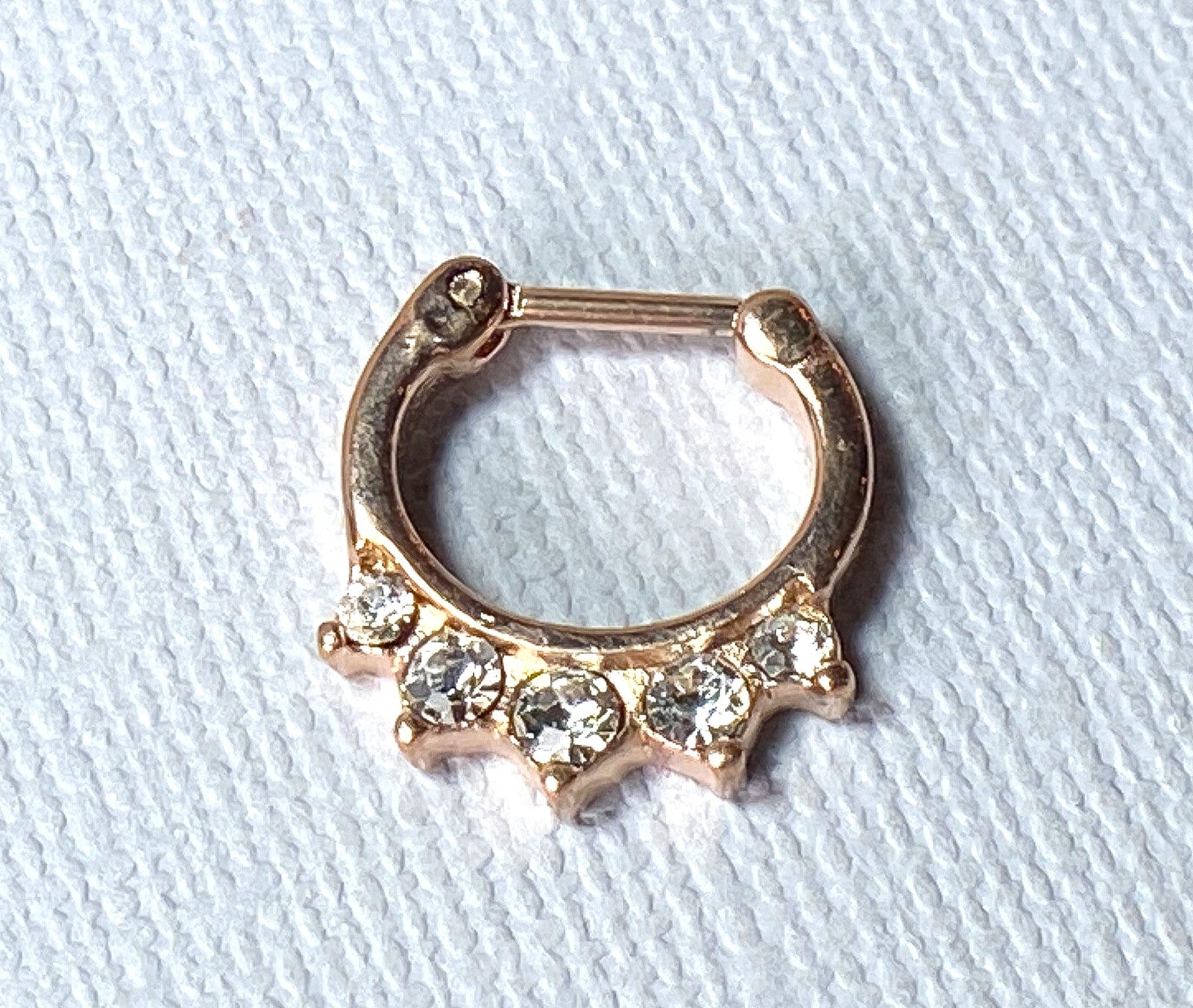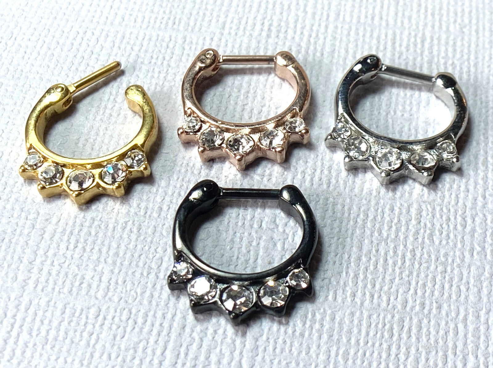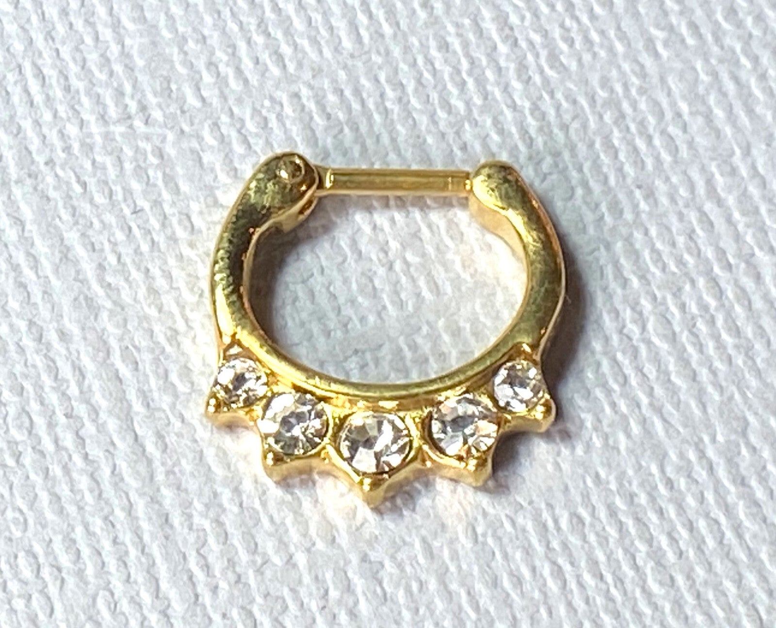 1pc 100% SURGICAL STEEL Five Crystal Gem Septum Clicker Nose Ring 16g Gold Black